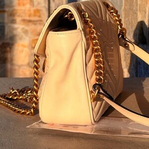 Stylish Gucci crossbody bag in beige. Features iconic gold chain and logo. Perfect for versatile wear.