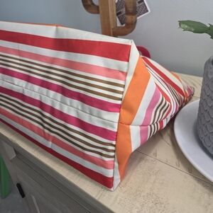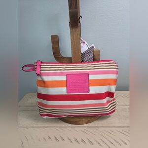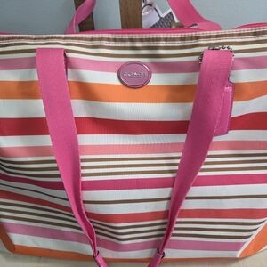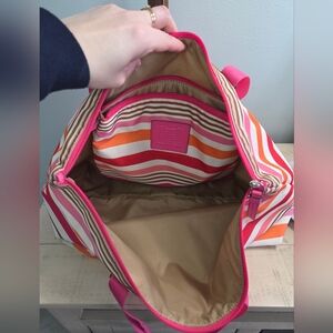 Coach Getaway Signature Weekender Tote in a multi-colored stripe pattern with pink straps, EUC
