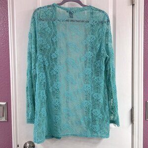 Long sleeve, open front cardigan with rose pattern. This color is hard to describe, maybe teal. This would be a great top layer over a dress to add something extra.