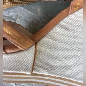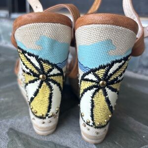 Stylish Coach wedges with tan leather straps. Cream canvas with beach-themed embroidery. Perfect for summer outings.
