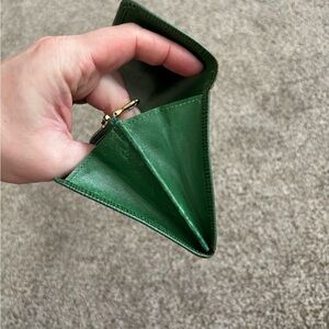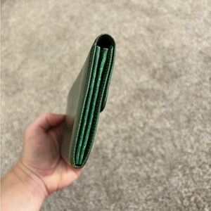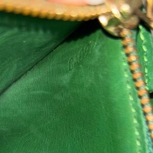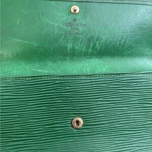 Beautiful *authentic* vintage (1994) Louis Vuitton Sarah long wallet in green epi leather. Snap closure in excellent working condition, zipper has visible wear but also in working condition. Heat stamp still very easy to read, does have some clear markings from use throughout the interior of the wallet. Please see photos! Visible wearing on upper corners, someone may have used a crossbody chain with this wallet previously. Zero separation between the compartments. Date code was difficult to photograph because it is directly by the end of the zipper when middle compartment is unzipped - CA0974. Spain, July 1994. Great gift for someone who loves vintage luxury, or add it to your personal collection!!! Does have a slight vintage smell. Please refer to all photos and description for accurate representation of the wallet!!! Thank you!