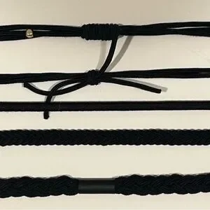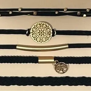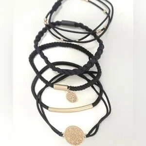 This stunning bracelet set features elegant black stretchy bands with gold accents, perfect for any occasion. The intricate gold detailing adds a touch of sophistication to your look.