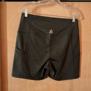 Sleek olive bike shorts by Reebok. Features two mesh side pockets. Perfect for active days.