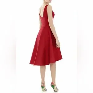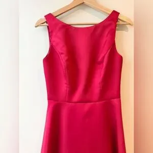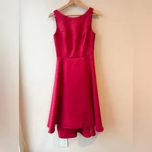 A perfectly flared skirt with a high/low hemline defines this lustrous cocktail dress. A bateau neckline, sleek princess seams and a scooped back make this satin design a perfect choice for weddings and evening events alike.