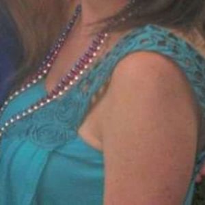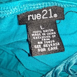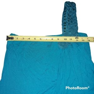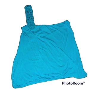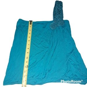 one shoulder light royal blue shirt, size small, soft light weight, elastic stretch around top trim and bottom, strap has flower and crochet circle design, measurements in pictures, banded around bottom trim