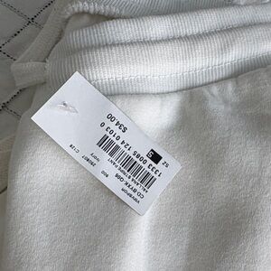 White sweatshirt and pants with multicolor stripes. Features Ron Jon logo with palm tree design.