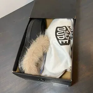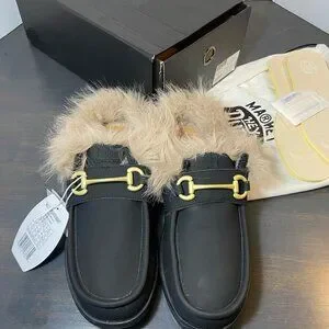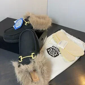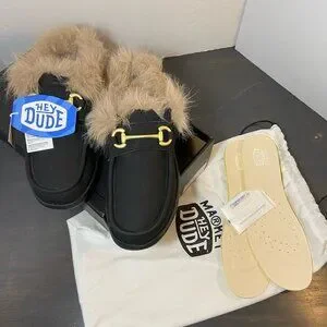 Brand new HEYDUDE Wally Slip Loafer Market edition in black/black. Features cozy faux-fur lining, lightweight flexible sole, and classic Wally slip-on comfort. Comes complete with original box, dust bag, and extra removable insoles.
