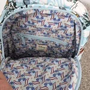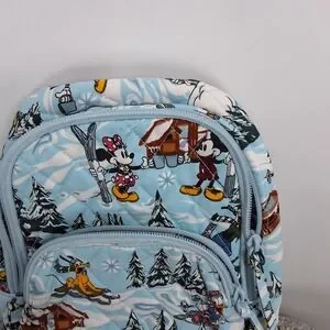 Light blue crossbody bag with Disney characters and winter scene. Features multiple zippered compartments.