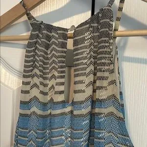 Stylish maxi dress with blue and gray chevron patterns. Ideal for versatile wear. Button closure