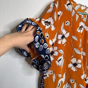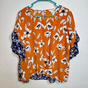 I have here this beautiful floral mustard golden yellow blue details short sleeve flowy ruffle blouse. This blouse is by Closetrix and is a size large.