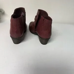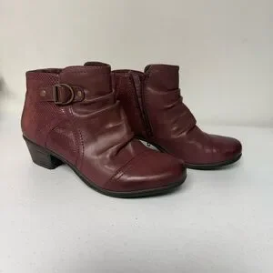 Chic and comfortable ankle booties. Rich red hue with stylish buckle detail. Ideal for versatile wear.