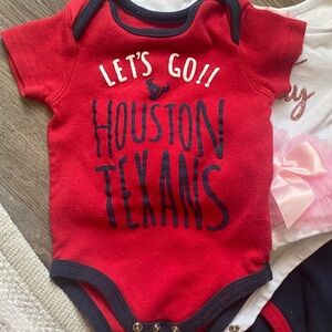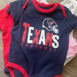 Set of two Houston Texans bodysuits and Game day bodysuit with pink tutu. Features team logo and text. Snap closures for easy dressing.