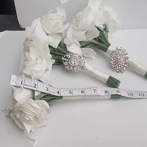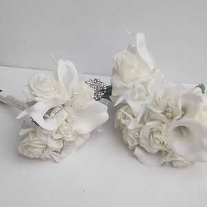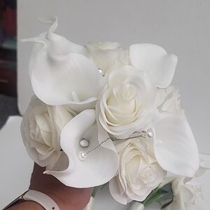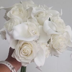 High-quality real-touch flowers featuring beautiful white roses, calla lilies, and pearl accents — they look and feel real. Pre-owned and used once for a wedding. Sold separately, three available for purchase. You could buy multiple and tie together to create a bridal bouquet. From a smoke-free, pet-free home. 💐