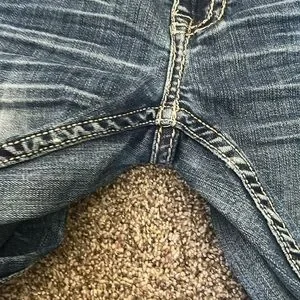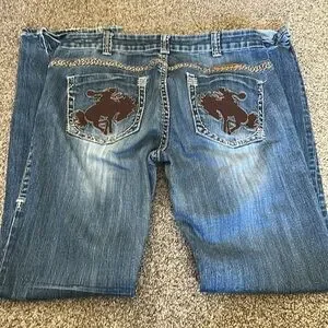 Stylish boot cut jeans. Features unique back pocket design. Perfect for casual wear.