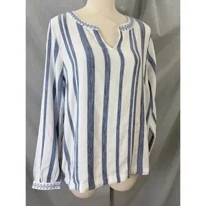 Pure Jill cotton top, blue stripe blouse, relaxed fit shirt, breathable summer top, coastal casual style, minimalist everyday wear, travel friendly blouse, women's size M, Coastal, Boho, Nautical, Summer, Beachy, Relaxed Fit, Embroidered, Striped, Lightweight, Casual, Preppy, Vacation, Resortwear, Split Neck, Tunic Style