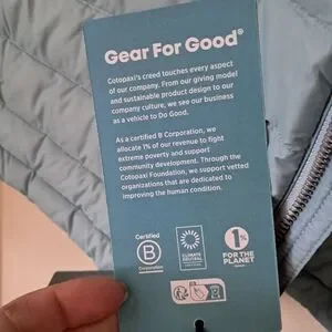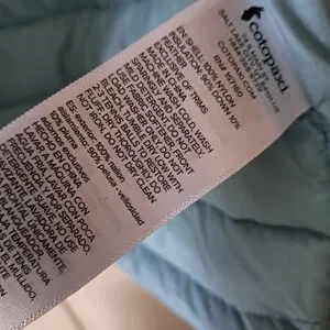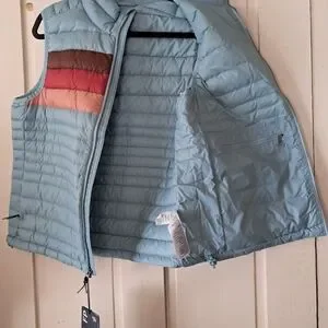 Stylish Cotopaxi puffer vest in blue with multicolor accents. Features a cozy design perfect for layering.