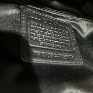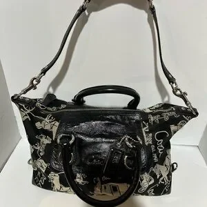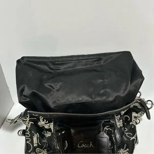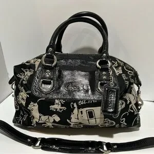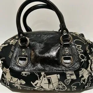 Elegant Coach satchel with black and tan design. Features signature logo and sturdy handles.