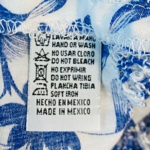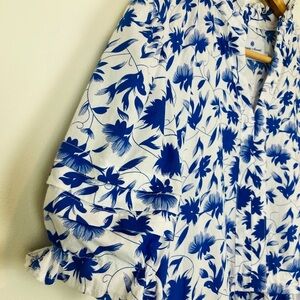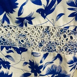 Margarita Mercantile blue and white hummingbird and floral print maxi or midi dress. Lots of pretty details. Ruffle at neck, pleating detail on puff sleeves and in skirt, and inset blue and white dyed lace near hem. Size Large