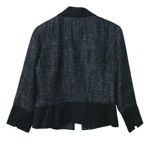 Adrianna Papell navy blue tweed blazer offers a sophisticated blend of textures, featuring a shimmering metallic weave paired with solid contrast panels at the collar, cuffs, and hem. This open-front jacket is designed with a structured shawl collar and long sleeves with vented cuffs, making it an ideal choice for professional settings or evening events. The interior is fully lined for a smooth fit, while the subtle sparkle in the tweed adds a touch of modern elegance to a classic silhouette. Size 8. Excellent condition.