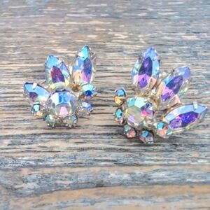 Vintage Continental Aurora Borealis Rhinestone Screw-Back Earrings - Iridescent Marquise Cluster Elevate your vintage collection with these stunning mid-century screw-back earrings by Continental. Featuring a brilliant cluster of Aurora Borealis (AB) coated rhinestones, these earrings capture and reflect a rainbow of colours—shifting from vibrant blues and purples to warm golds and pinks. The design showcases a mix of round and elegant marquise-cut stones in a tiered, fan-like setting. Brand: Hallmarked "CONTINENTAL" on the screw-back pads. Era: Circa 1950s–1960s. Closure: Adjustable screw-back (perfect for non-pierced ears). Condition: Good vintage condition with bright stones and secure prong settings.