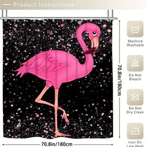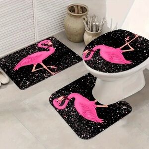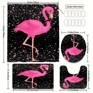 4pc Pink Flamingo Bathroom Set - Waterproof Curtain, Non-Slip Mats, Toilet Lid Pad, U-Shaped Bath Mat