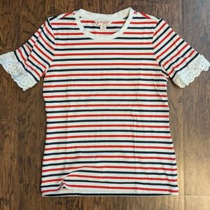 Stylish striped tee with lace sleeves. Features red and blue stripes. Comfortable and chic design.
