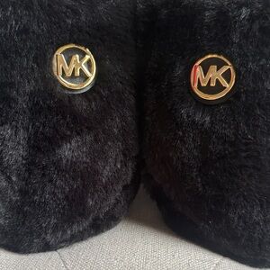 Luxurious black slippers with plush texture. Features iconic gold tone MK logo detail. Perfect for lounging. Soft and comfort. Worn once. Smoke free home. Sole approx 11 inches. Perfect for size 7.5/8.