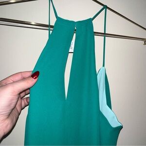 Express sleeveless halter-style blouse in a rich green/teal shade. Lightweight and flowy with a flattering neckline and open keyhole back detail. Perfect for date nights, summer outfits, or dressed up for work.