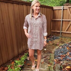Collared button down shirt dress, long sleeve, brown and white cheetah / leopard / animal print, perfect for transitional weather from winter to spring or summer to fall