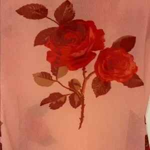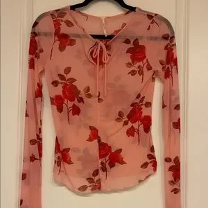 Free People sheer lettuce edge top with tie neck and gorgeous red rose floral pattern. The pink and red hues add a touch of romance. Worn once, EUC.