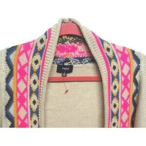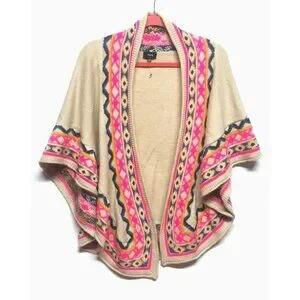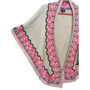 Vibrant Aztec/ Southwestern print shawl/ poncho/ cape/wrap/ front open cardigan by Fate. One size fits all since there are no armpits. The whole thing is just one piece that goes over your shoulders, back and hangs in the front. Beautiful tan/ neutral background with neon pink vibrant design.