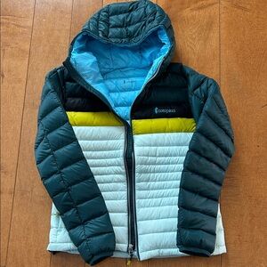 Stylish down puffer jacket with a hood. Features a mix of dark green, yellow, light blue, and white colors. Perfect for outdoor adventures!