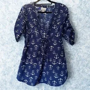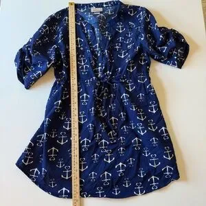 The Oh! Momma Blue Sailor Nautical Maternity tunic is a stylish and versatile garment perfect for casual occasions during the summer and spring seasons. This V-neck, pullover top features short sleeves and a nautical theme in navy and white colors, making it a chic choice for women who appreciate a touch of sailor-inspired style. Made by Oh! Momma, this top is a size large and is designed with a maternity length and button accents, offering a trendy and comfortable option for everyday wear.