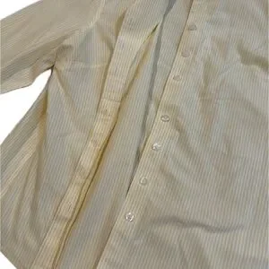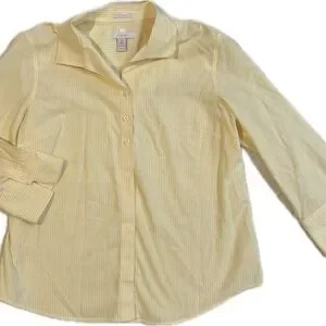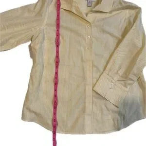 Chico's button down shirt in light, butter yellow. Features subtle stripes. Ideal for casual wear.