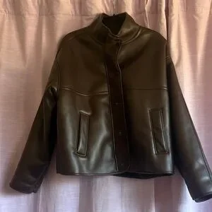Elevate your style with this chic brown faux leather jacket. Perfect for any occasion, this jacket offers both comfort and elegance.