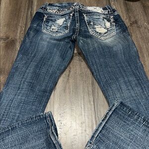 Chic distressed design. Signature embroidery on back pockets. Perfect for casual style. Has stain on front leg has inseam is 31 in