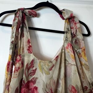 Chic floral maxi dress with layered design. Features vibrant pink flowers on a cream background. Ideal for elegant occasions. Bust: 40” Waist: Free Hips: Free Length: 55.5”