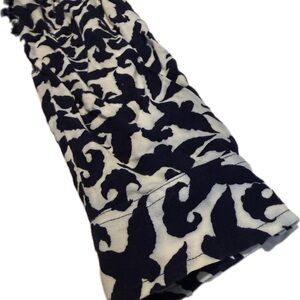 Elegant tunic/ blouse with intricate navy blue bird pattern. Soft fabric and comfortable fit with ruching at the waist and button up feature.