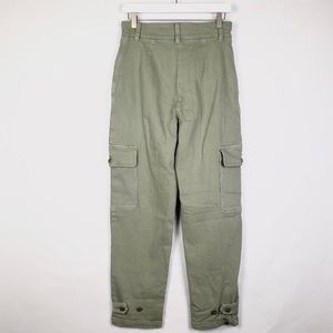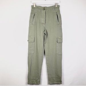 high-waisted utility pants with slash hand pockets, side cargo pockets and adjustable tabs at the hem. They’re made with cotton twill that has a comfortable amount of stretch.