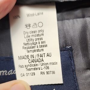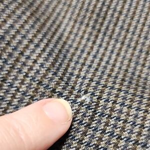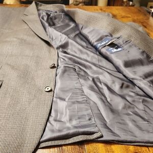 Timeless gray and blue houndstooth two button blazer by Ralph Lauren. Notched lapels. Chest pocket. Made exclusively for Dillard's. This jacket does have two tiny flaws, as pictured. one in the right sleeve and the other on the lower back. The bottom button is loose. Ideal for business or professional occasions. (N3)