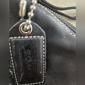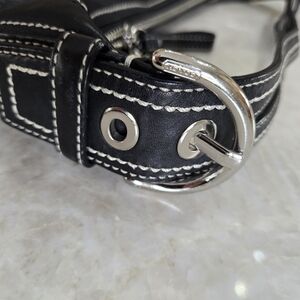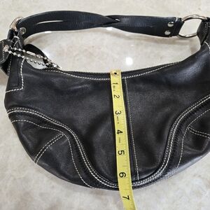 Elegant black leather hobo bag by Coach. Features contrast stitching and adjustable strap. Ideal for daily wear. Excellent condition from smoke free and pet free home.