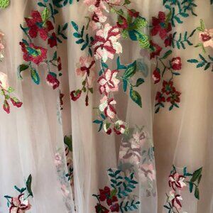 Features delicate multicolor floral embroidery over soft blush tulle with a flattering fitted bodice and flowy skirt. The back has a beautiful sheer panel with covered buttons for an elegant, timeless look. Light, comfortable, and incredibly photogenic.