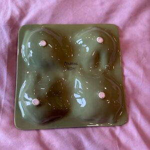 Beautiful FARVAL ceramic serving dish featuring a raised leaf motif design in a rich green glaze. Square shape with four individual leaf impressions, making it perfect for serving appetizers, nuts, olives, candies, or for decorative display.