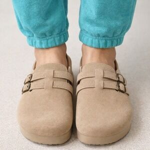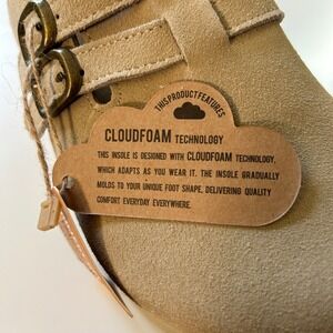 Project Cloud platform clogs in a versatile tan suede finish. These slip-on mules feature a double-strap buckle design across the vamp for an adjustable fit and a stylish touch of hardware. Built for comfort, they include a genuine leather insole with Cloudfoam technology that molds to your foot, paired with a supportive cork-wrapped midsole and a chunky platform. The textured rubber outsole provides reliable traction for daily wear. NO BOX.