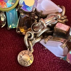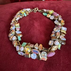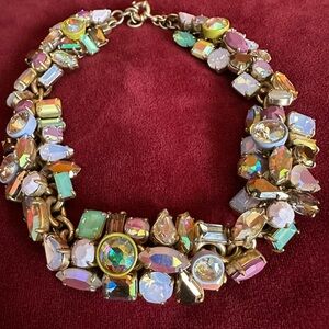 This stunning statement necklace features a vibrant array of gemstones in gold settings. Perfect for adding a pop of color to any outfit.