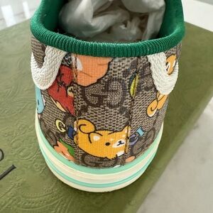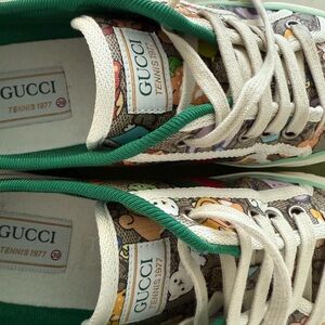 Charming Gucci sneakers with cartoon characters. Beige base with colorful accents. Iconic green and red stripes.