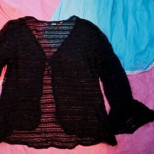 The cherry on top of any fun-and-sexy classy Lingerie collection is sure to be decked out with this very sexy vintage cover-up piece to wear with your favorite chemise or teddy or a cute pair of panties with heels. It is is great condition! Black well crafted stretchy sheer lace and tied up with a satin bow ribbon in front. No holes, rips or tears. Even perfect for layering over your favorite cami tops! (non-smoking home)