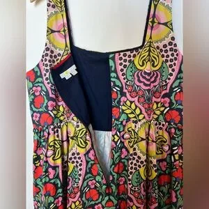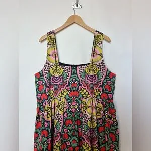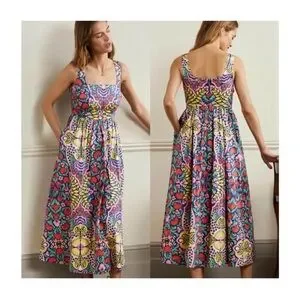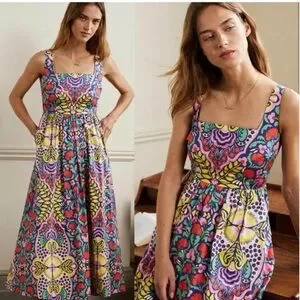 Bold and cheerful Boden midi dress featuring a square neckline, wide straps, and a fitted bodice with a gently gathered skirt. Crafted from breathable cotton with a touch of stretch for comfort. Eye-catching folk-inspired floral print throughout with a back zip closure and functional side pockets. Bodice has a double-layered construction for structure, while the skirt is single-layer. Bright, saturated colors with strong visual impact and a flattering, easy-to-wear silhouette.