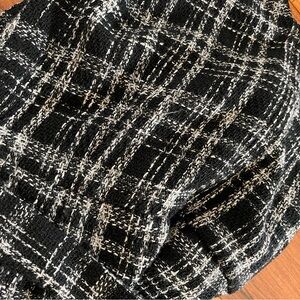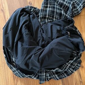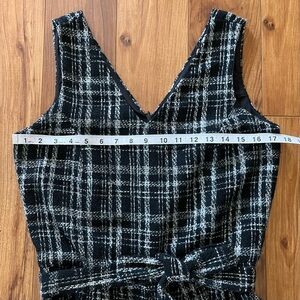 100% poly, fully lined, v neckline, adjustable belt tie at waist, black and white tweed fabric, approx measurements shown, sleeveless, minimally worn, great for the office, buisness casual