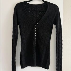 Stylish black button-up cardigan with a deep V-neck. Perfect for layering.